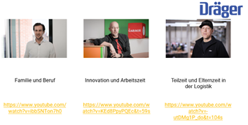 Daher habe viele Väternetzwerke gemeinsam mit Personalverantwortlichen flexible Arbeitszeitmodelle entwickelt, die diesem Wunsch der Väter gerecht werden. Auch Dräger hat mittlerweile eine Reihe von individuellen Lösungen für Väter gefunden, die den Wunsch geäußert haben, mehr Zeit mit der Familie zu verbringen. Damit auch andere Väter motivieren werden diesen Beispielen zu folgen und um potentielle Mitarbeiter für das Unternehmen zu begeistern, stellt Dräger einige dieser Arbeitsmodelle in einer Role Model Kampagne vor. Die Videos sind für jeden auf YouTube verfügbar.